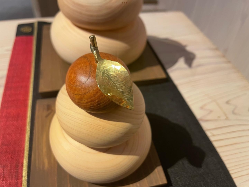 お餅は桧、みかんは欅、みかんの葉は真鍮でできいます。
