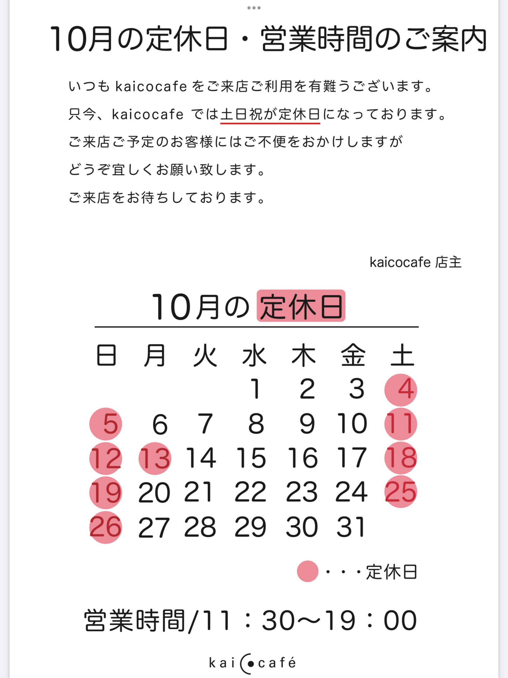 只今kaicocaféでは土日祝が定休日となっております。