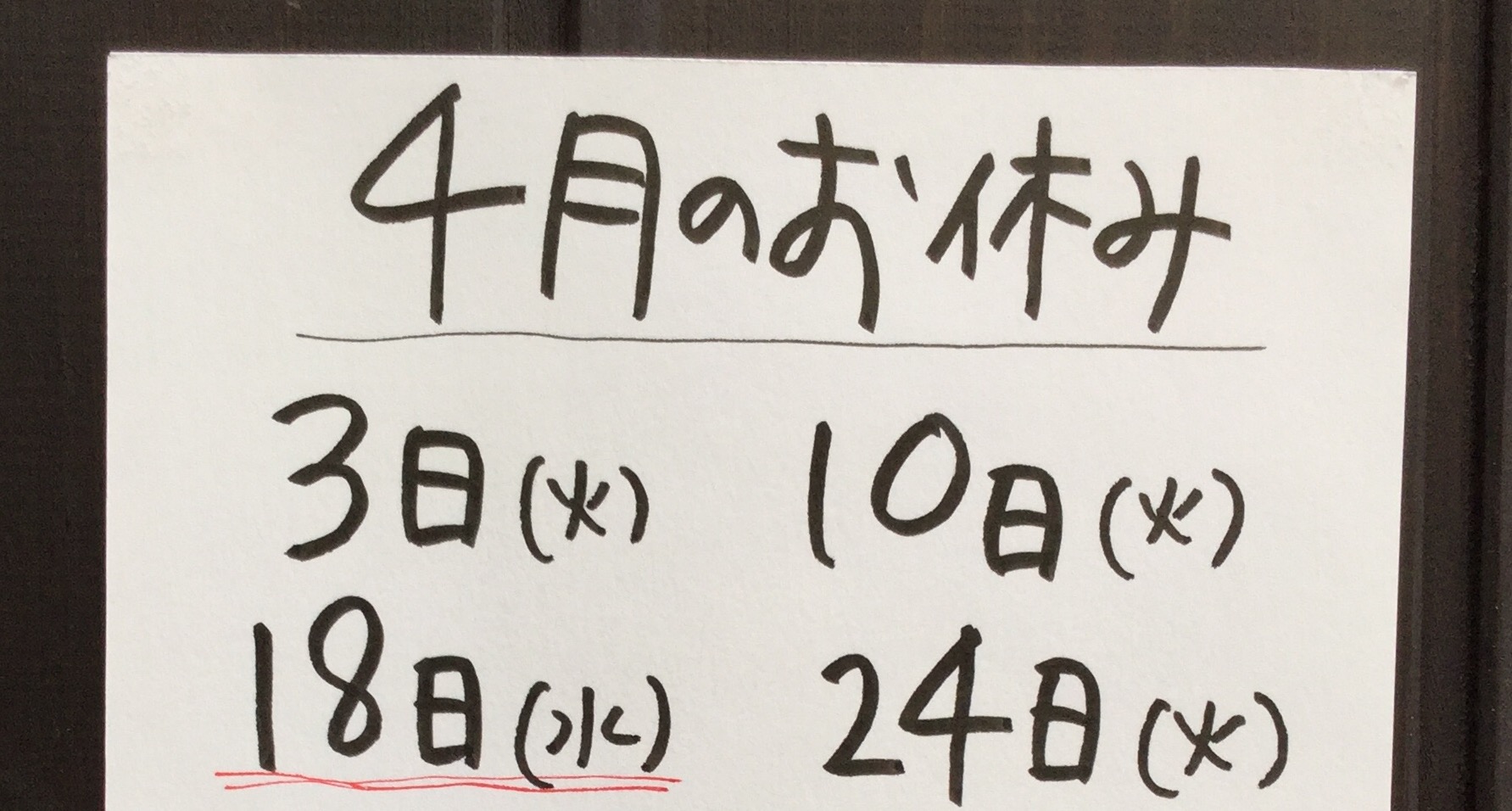 代わりに18日水曜日をお休みとさせていただきます。
